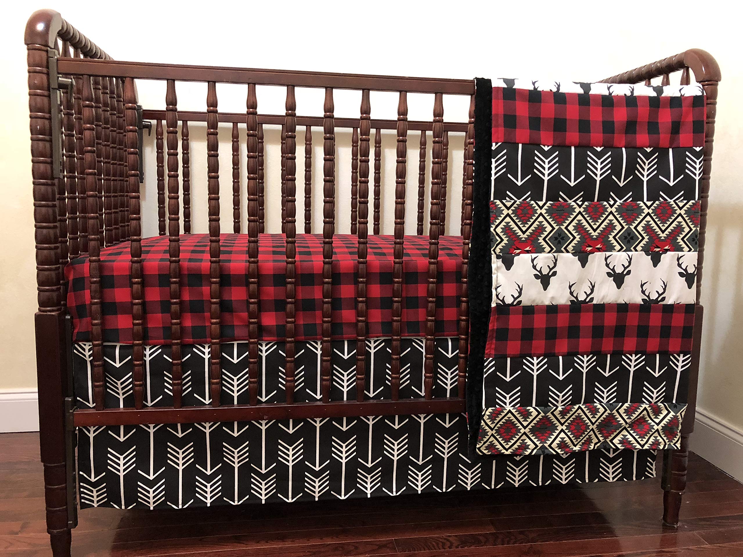Coral and teal arrow crib bedding. Beautiful woodland nursery and rustic crib bedding for baby boys and girls. Buffalo plaid, woodland, linen & more unique baby boy bedding in stock and handmade in the usa!