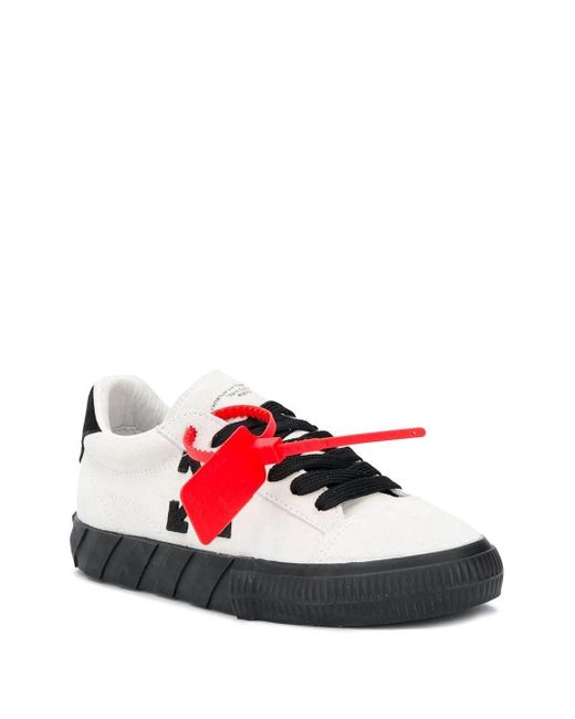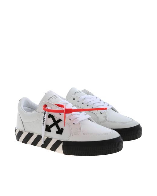 View Off White Shoes Arrow Low PNG. This and that text printed at back in white. They have a flat rubber sole with black stripes and orange highlights.
